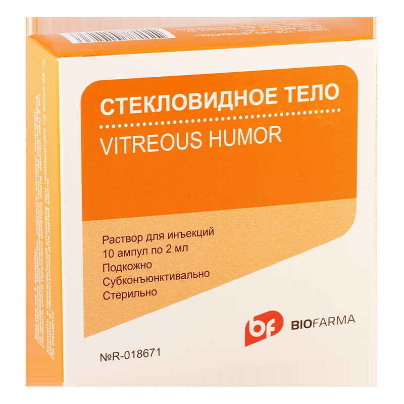 Переработанное стекловидное тело скота в виде раствора. В ампуле 2 мл, а в коробке — 10 штук.